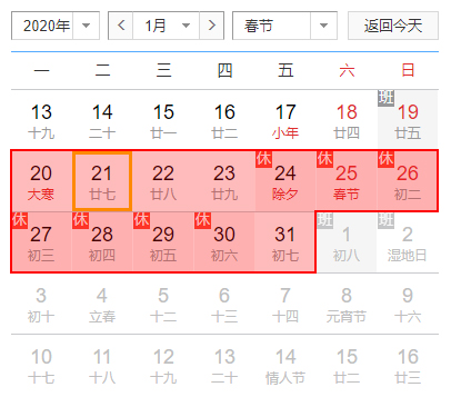 ? ? ? ?一、春節(jié)放假時間:2020年1月20日(農(nóng)歷臘月二十六)至2020年1月31日(農(nóng)歷正月初七)放假,共12天。2月1日(星期六)開始上班,2月2日(星期日)正常上班,如下圖所示。